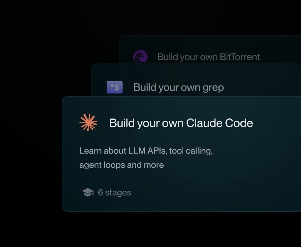 Rebuild the tools you use every day with your own hands. Recreate Redis, Git, SQLite - from scratch, in your language, in your IDE.